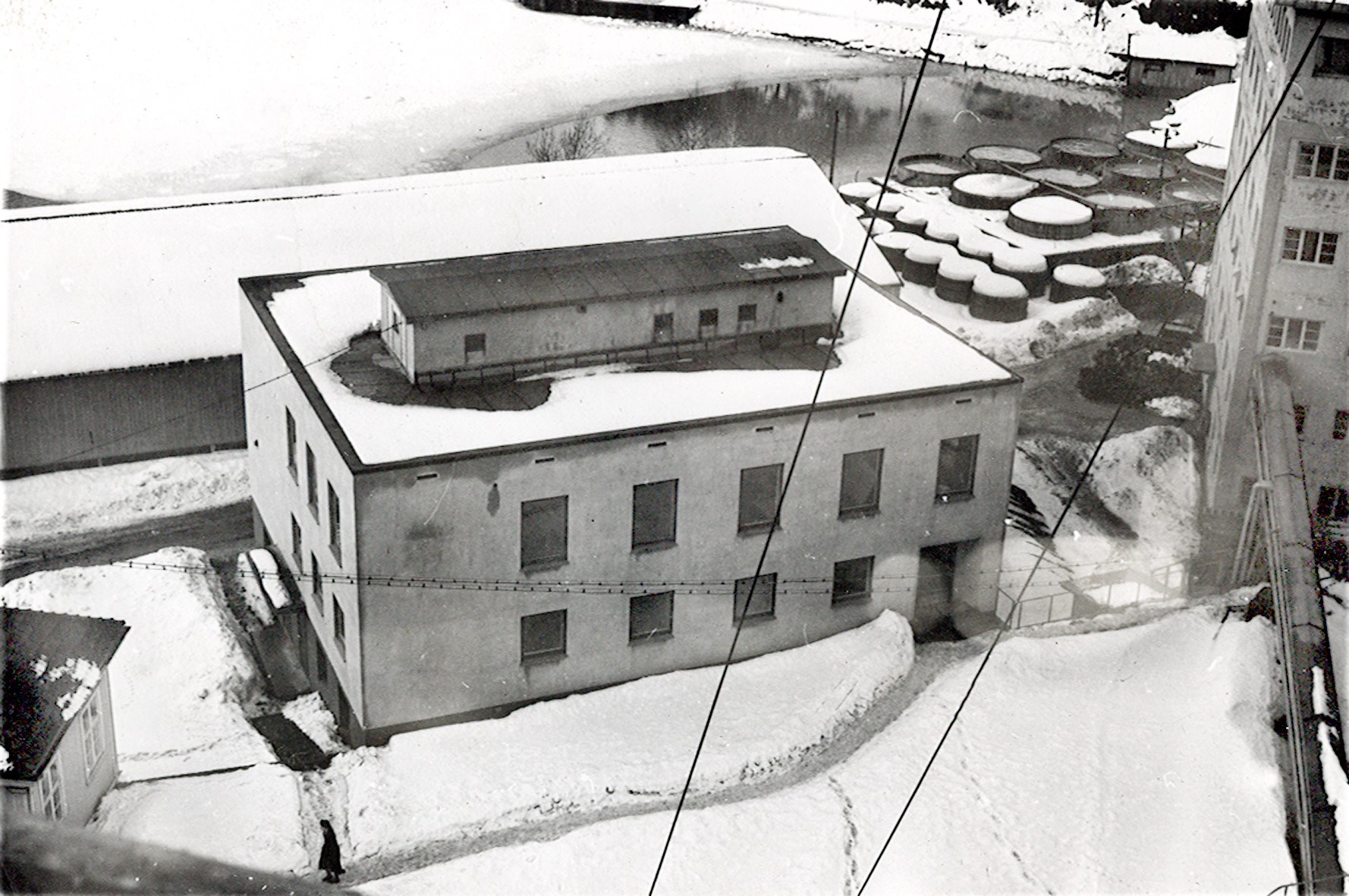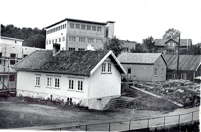 Smelteverket. Laboratoriebygningen. Kontorene i 1. etasjes hjørne til venstre inneholdt innkjøpsavdeling fram til 1964. Senere er huset omdisponert til flere tjenester. Til venstre kontorbygningen. Til høyre Mikroanlegget med utfellingskar utenfor. Båthus i Bekkevika, og litt av Kommunebrygga. Foto: Ukjent. Stort bilde
