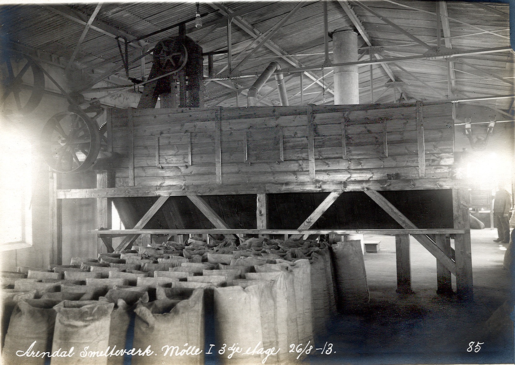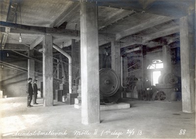 Smelteverket. Mølle II, 3. etasje. Produksjonsutstyr. Foto: Løvfold, 1913. Stort bilde