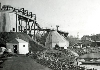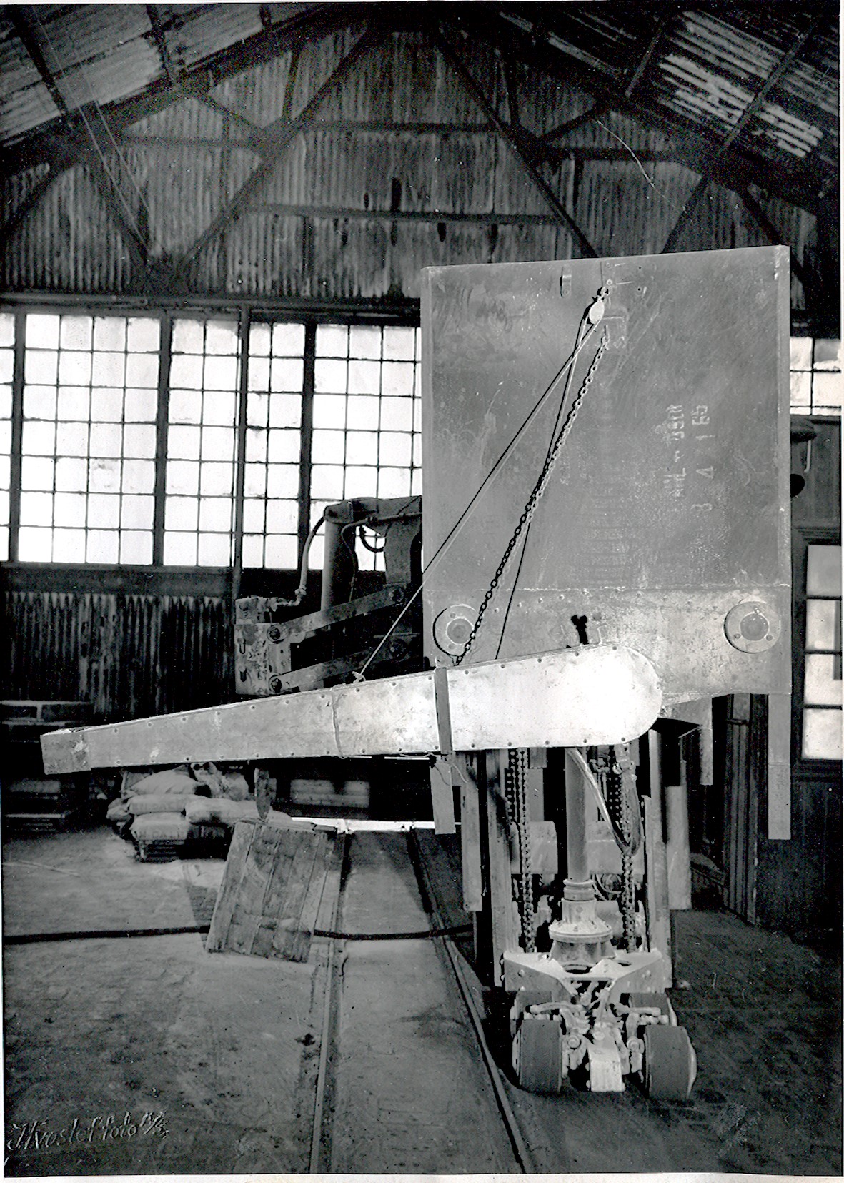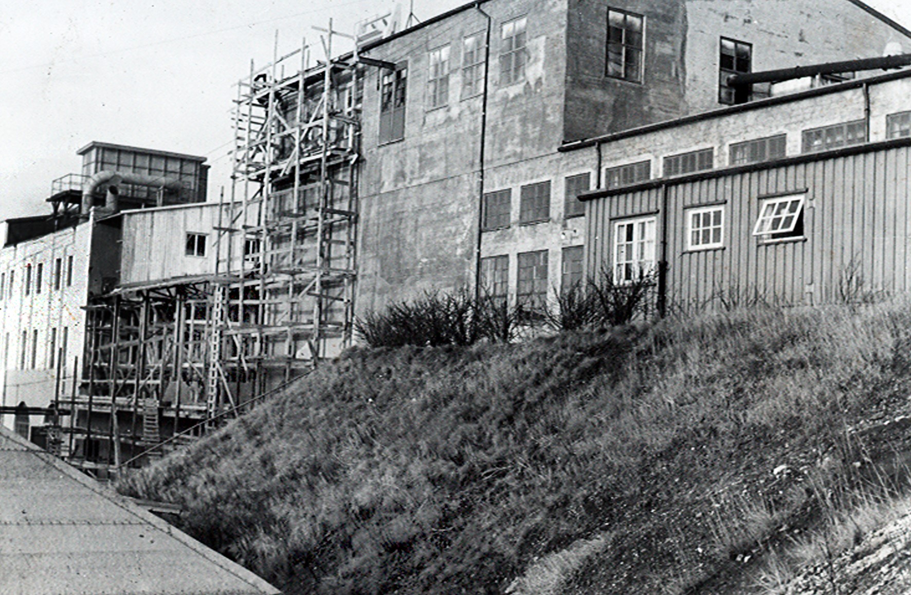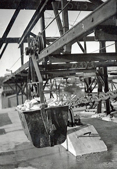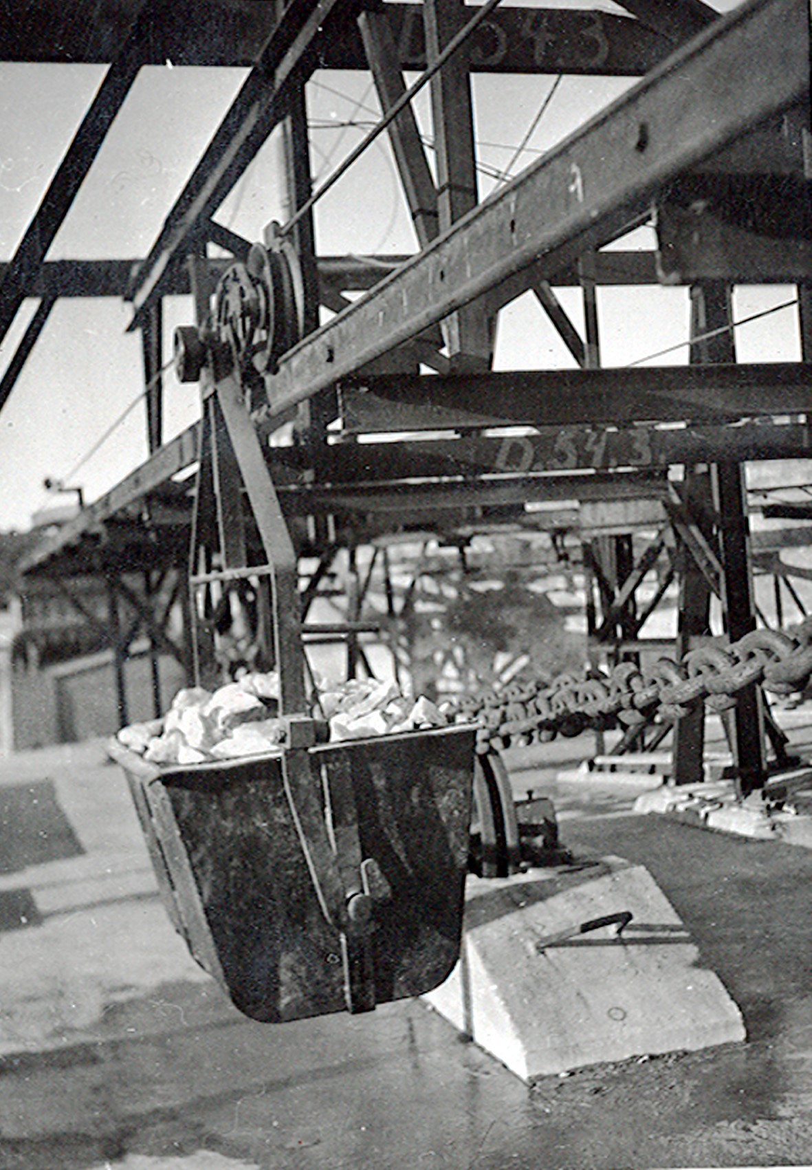 Smelteverket. Pabygging Mølle I. Heisanordning for betong. Transportbelte for ramaterialer til høyre, bakenfor Ovnshus A. I forgrunnen sykkelstall og en tilhenger for lastebil. Foto: Ukjent. Stort bilde