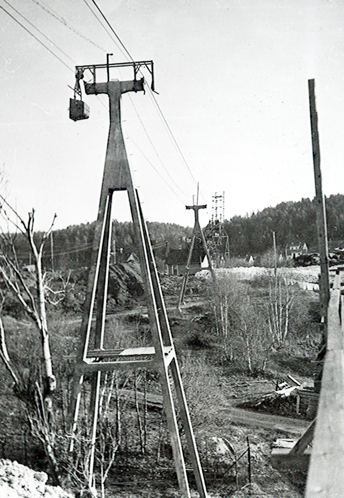 Smelteverket. Betong taubanemaster. Taubanevogn (tobb) tom i retur til importkai. Wisbech losseapparat i bakgrunnen . Omdalsøyren på Tromøy bakenfor der. Foto: Ukjent. Stort bilde