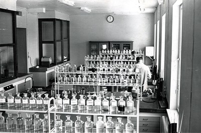 Smelteverket. Laboratoriet. Analysesalen. Flasker med kjemikalier. Fire arbeidsbenker. Glødeovner til venstre. Foto: Ukjent. Stort bilde