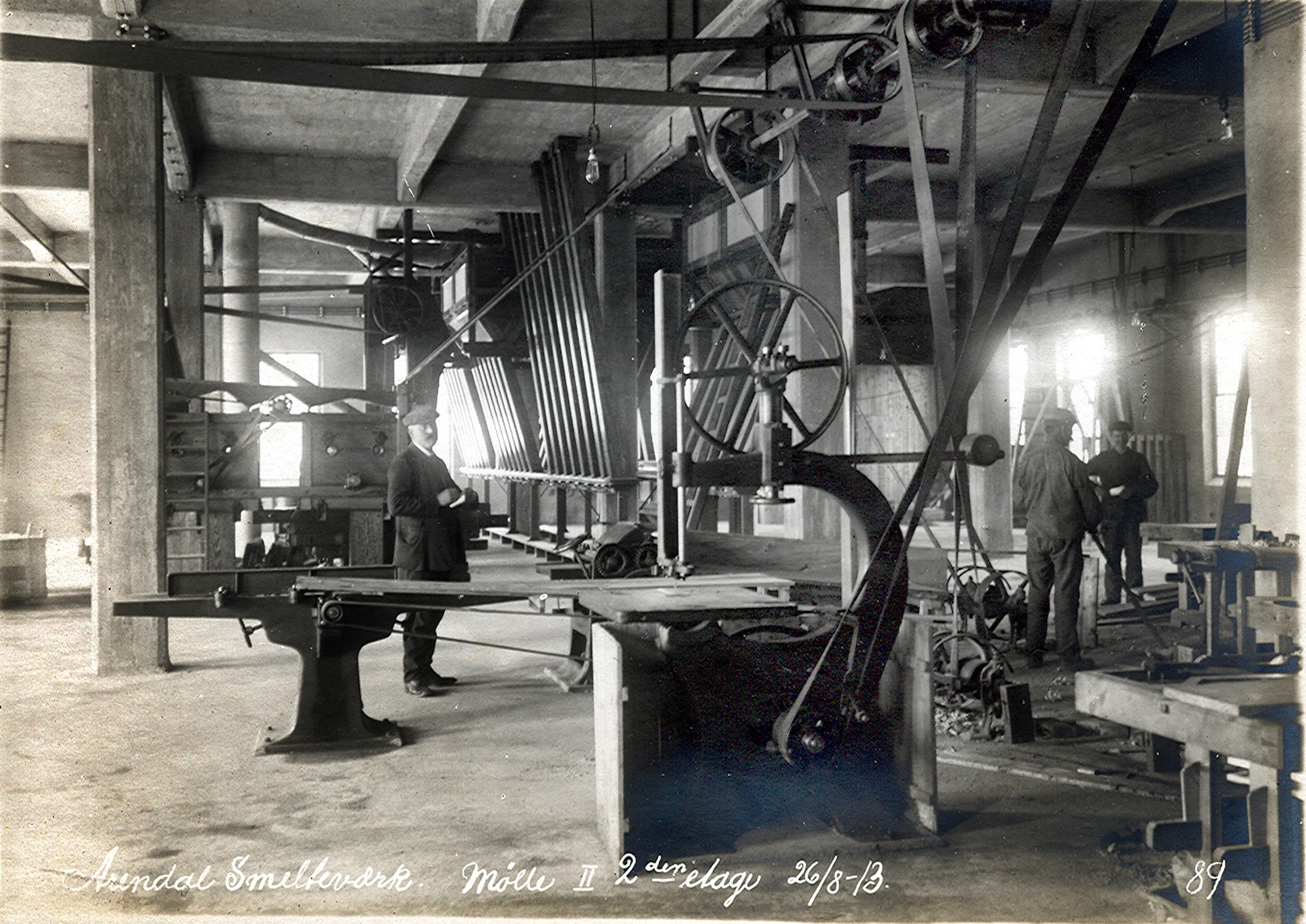 Smelteverket. Mølle II, 2. etasje. Midlertidig i bruk som snekkerverksted. Avretterhøvel, bandsag, høvelbenker, remdrift for maskiner. Foto: Løvfold, 1913. Stort bilde