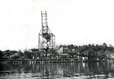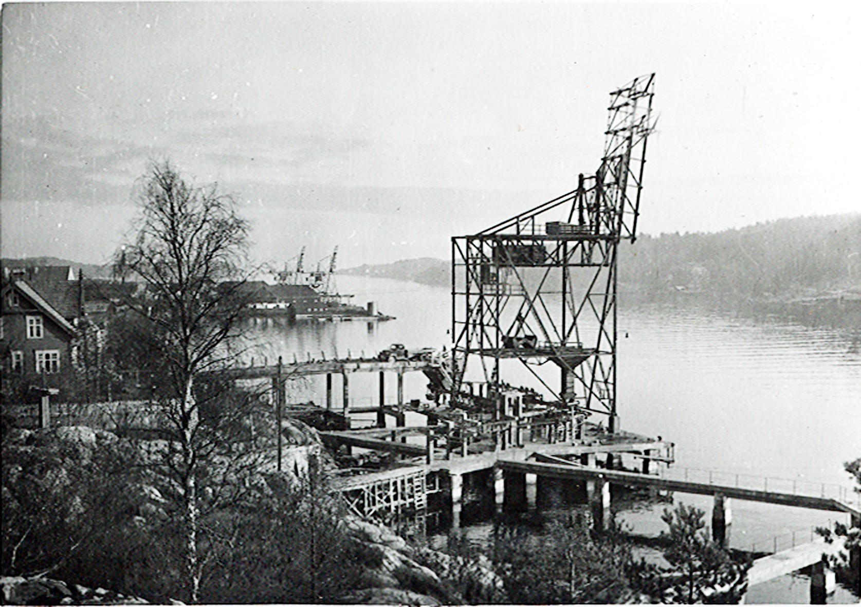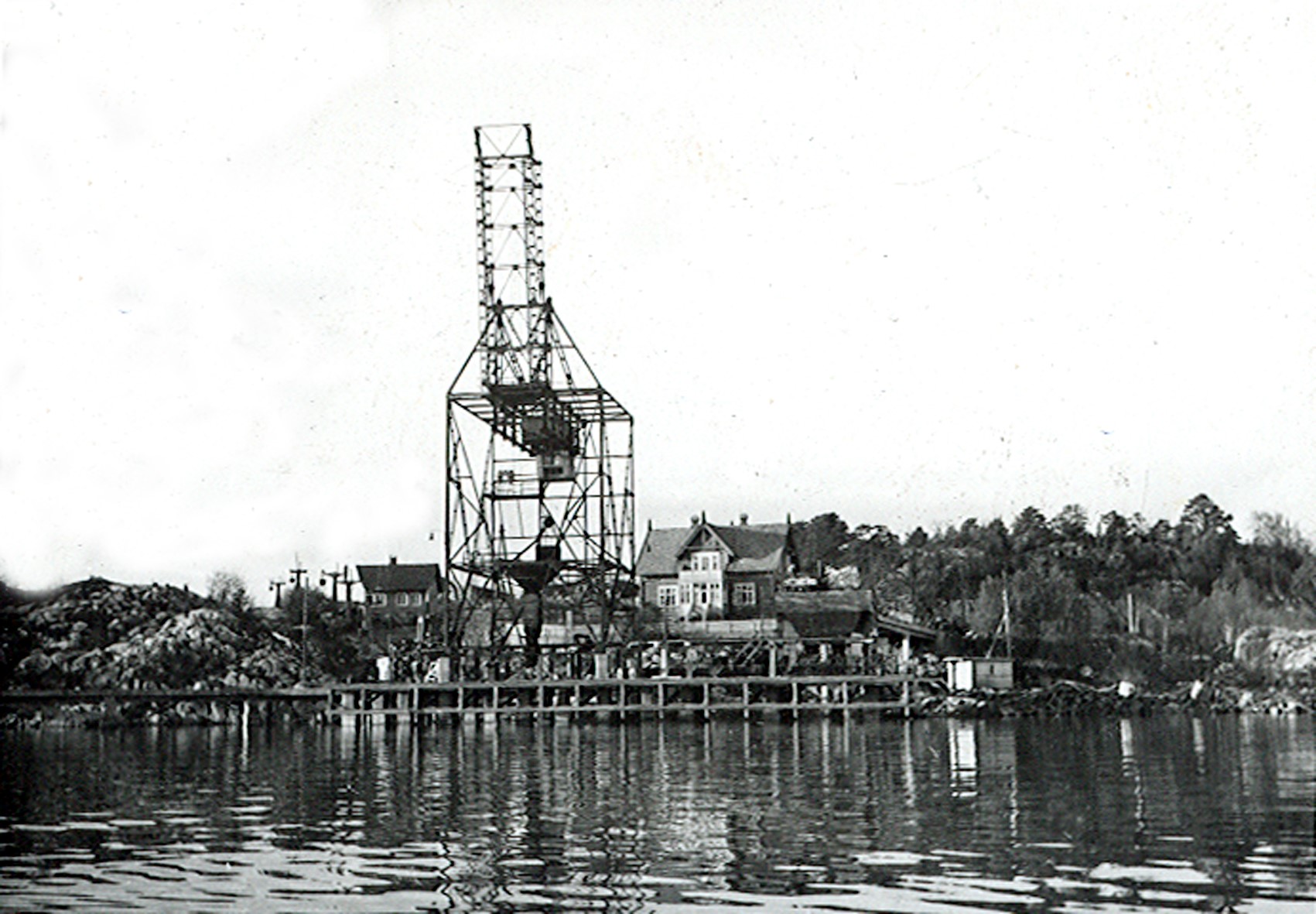 Smelteverket. Importkai med Wisbech losseapparat. Huset til venstre (bygd 1860, revet 19??) var eid av Aaste Knudsen for Smelteverket. Tyra og Per Andersson bodde her noen år. Huset til høyre for losseapparatet er bygd 1917, og revet 1972-1975. Helt til høyre ferjestedet i Bukkevika. Foto: Ukjent. Stort bilde