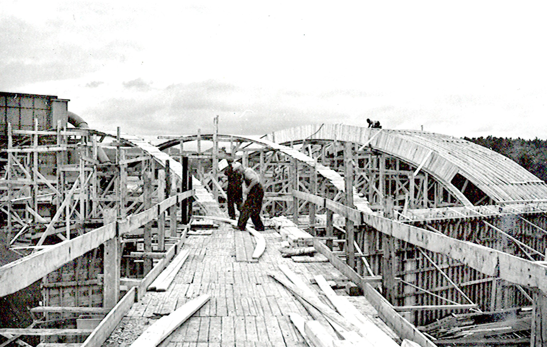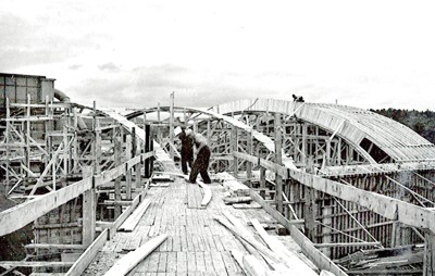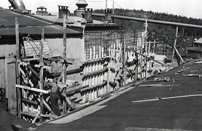 Smelteverket. Forskaling. Ombygging taubane/silo. Forskalinger. Foto: Thorleif Wimme, 1956. Stort bilde