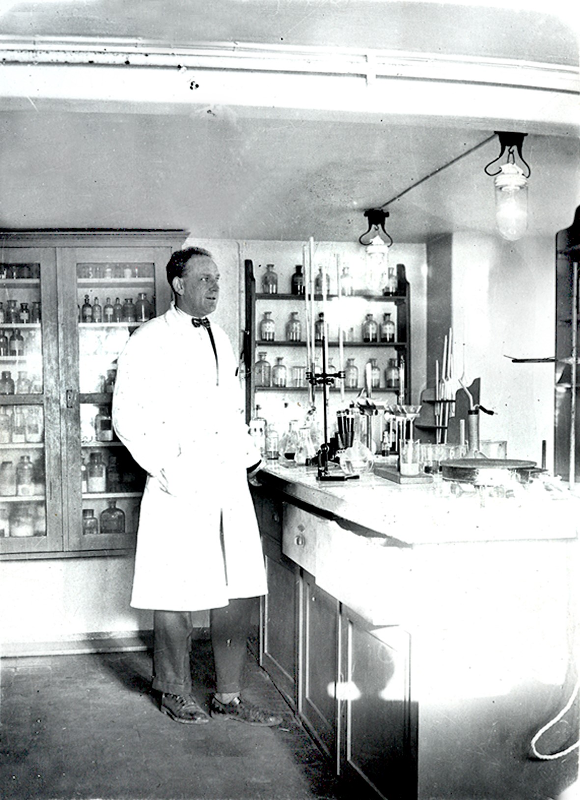 Smelteverket. Det første laboratorium i kontorets kjelleretasje. Kjemiingeniør Alex Henriksen. Foto: Ukjent, 1928. Stort bilde