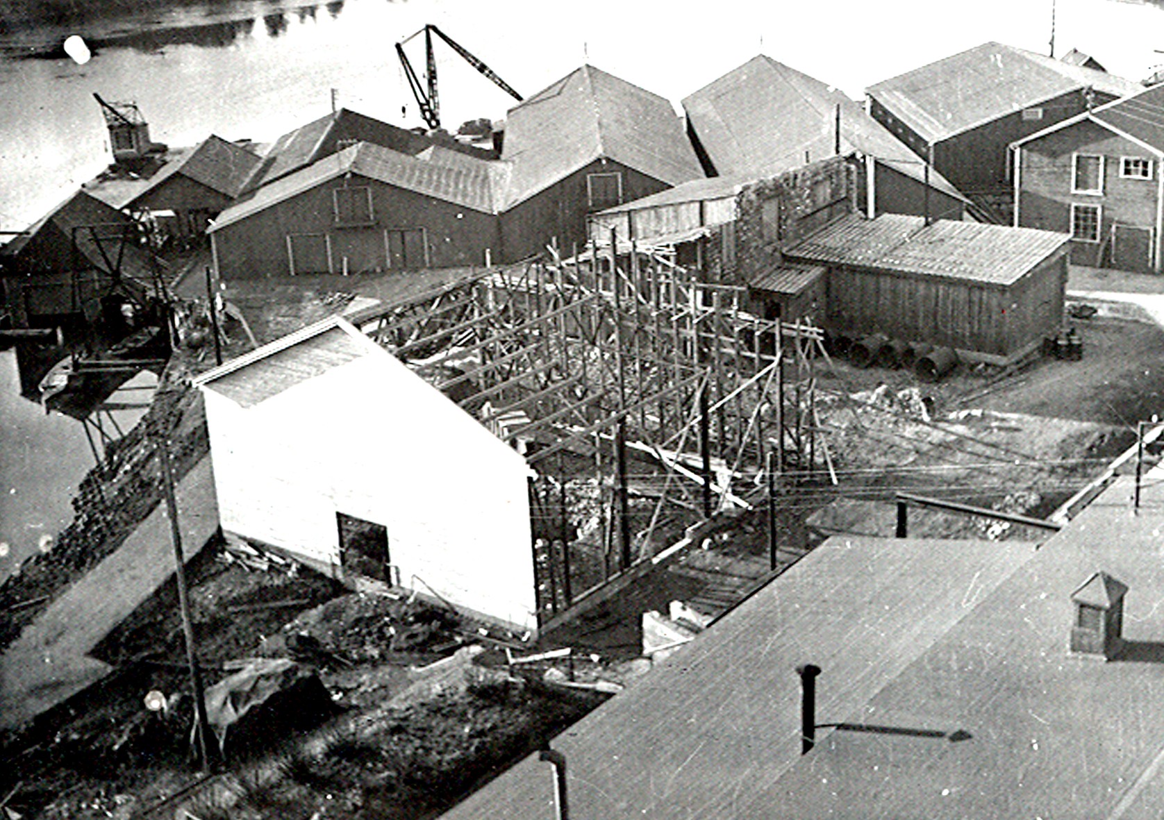 Smelteverket. Bygging av nytt laboratorium. Heisanordning for betong. Forskaling 1. etasje. I bakgrunnen Mikroanlegget. Det "gamle" laboratorium til høyre. Foto: Thorleif Wimme, 1956. Stort bilde