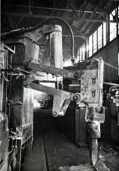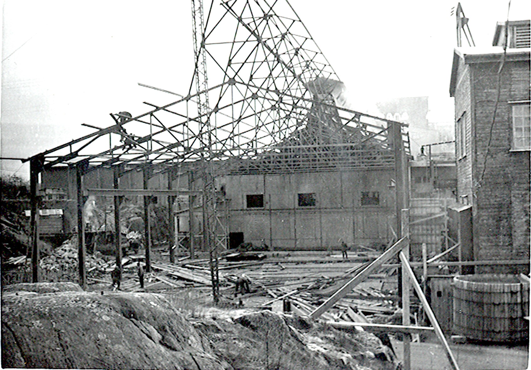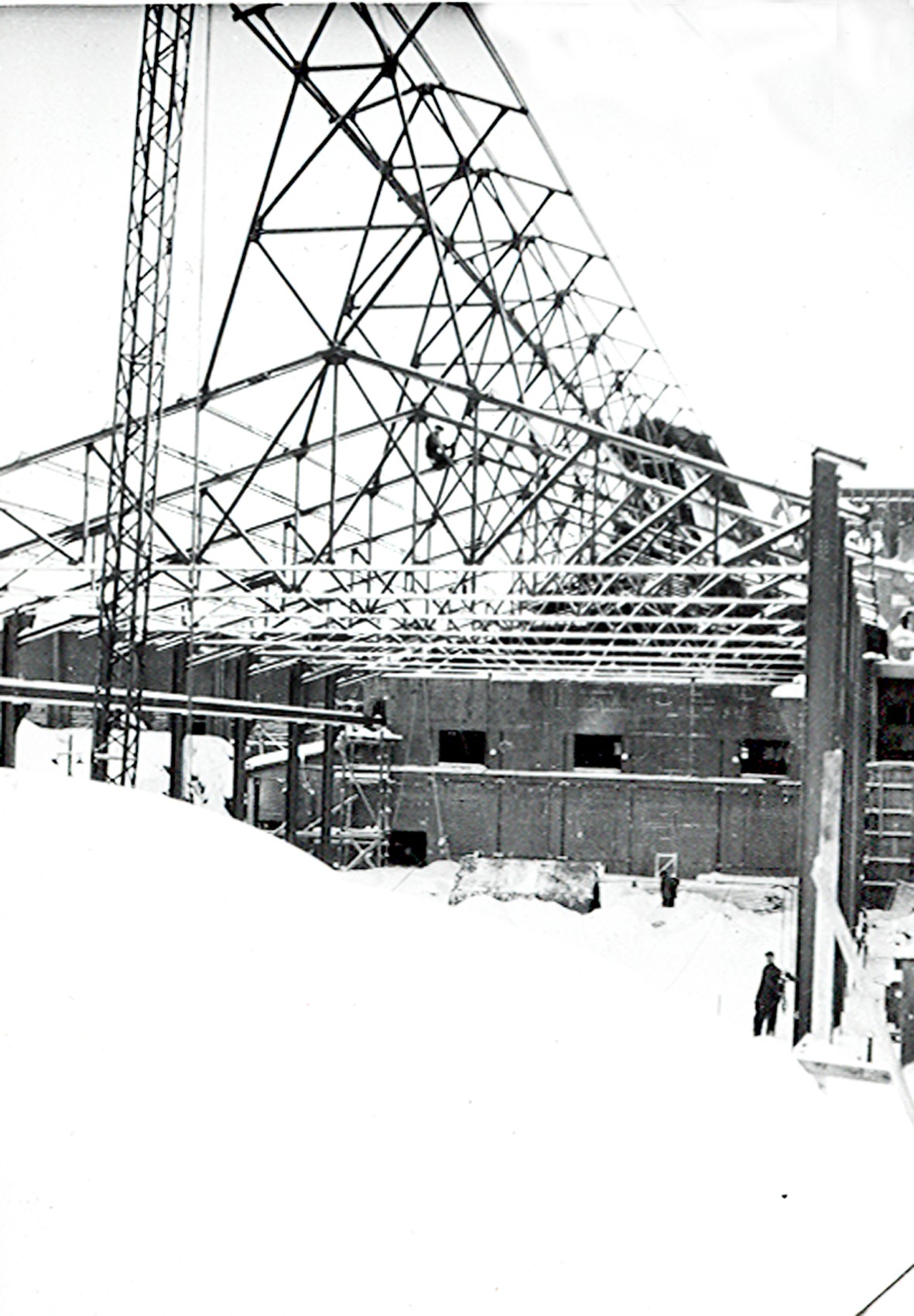Smelteverket. Forlengelse av Ovnshus A. Stålkonstruksjoner. Heisanordning for stålkonstruksjoner. Tidligere ovnshus i bakgrunnen. Foto: Ukjent. Stort bilde