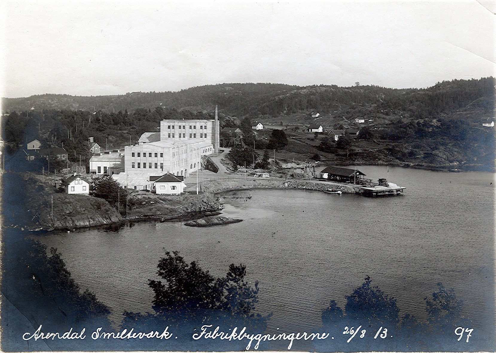 Smelteverket. Panorama fra Husefjellheia. Det lille hvite huset var eid av Ole Johansen for Smelteverket. Huset benyttet til Laboratorium senere. Kontorbygningen i forgrunnen. Bakenfor Mælle II, Ovnshusene og Mølle I. Til høyre kaianlegget med taubane. Bekkevika inn til venstre. Til høyrre Østre Hellesund, Palsodden og Tromøy i bakgrunnen. Foto: Løvfold, 1913. Stort bilde