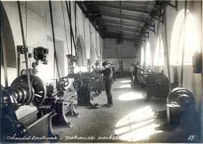 Smelteverket. Mekanisk verksted med hovedelektromotor og removerføring (ubeskyttet) til de forskjellige maskiner. Foto: Løvfold, 1913. Stort bilde