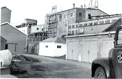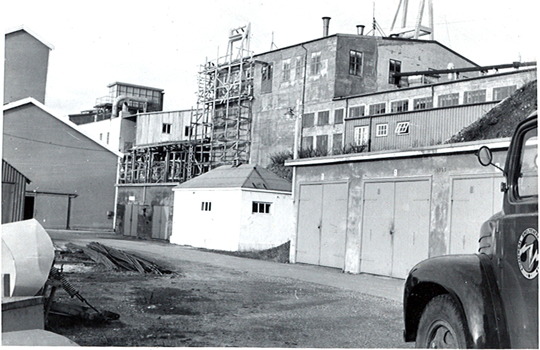 Smelteverket. Rå-SIKA-siloer under bygging. Til venstre Kulemølle hus, deretter Mølle II med filteranlegg på taket. Foran WC og garasjer for trucks. Lastebil med firmamerket. Foto: Thorleif Wimme, 1954. Stort bilde