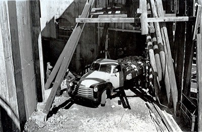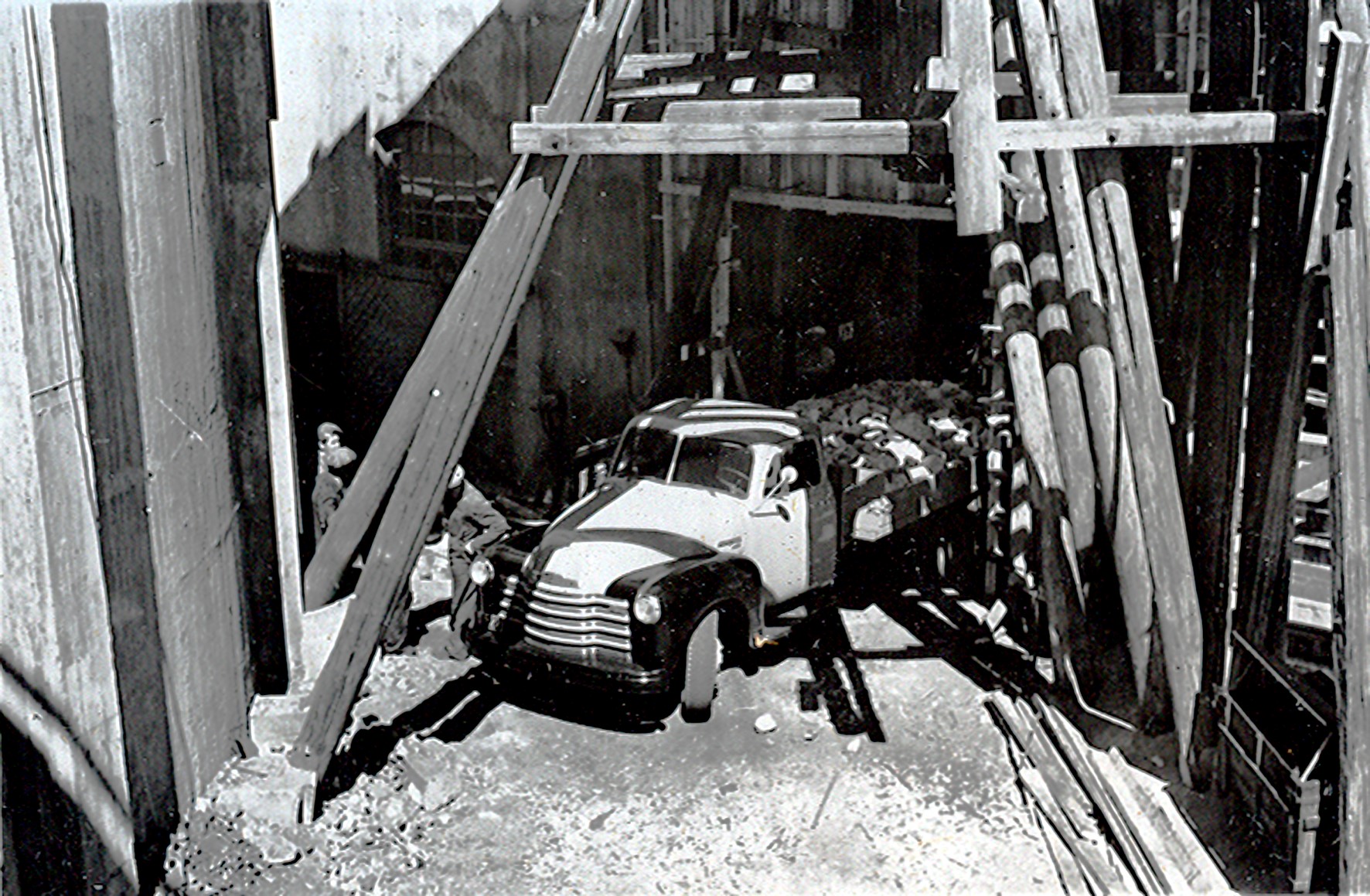 Smelteverket. Mølle I/Råmateriallageret. Levering av kvarts med lastebil fra kvartsgruben. Foto: Thorleif Wimme, 1956. Stort bilde