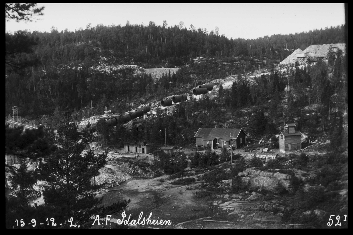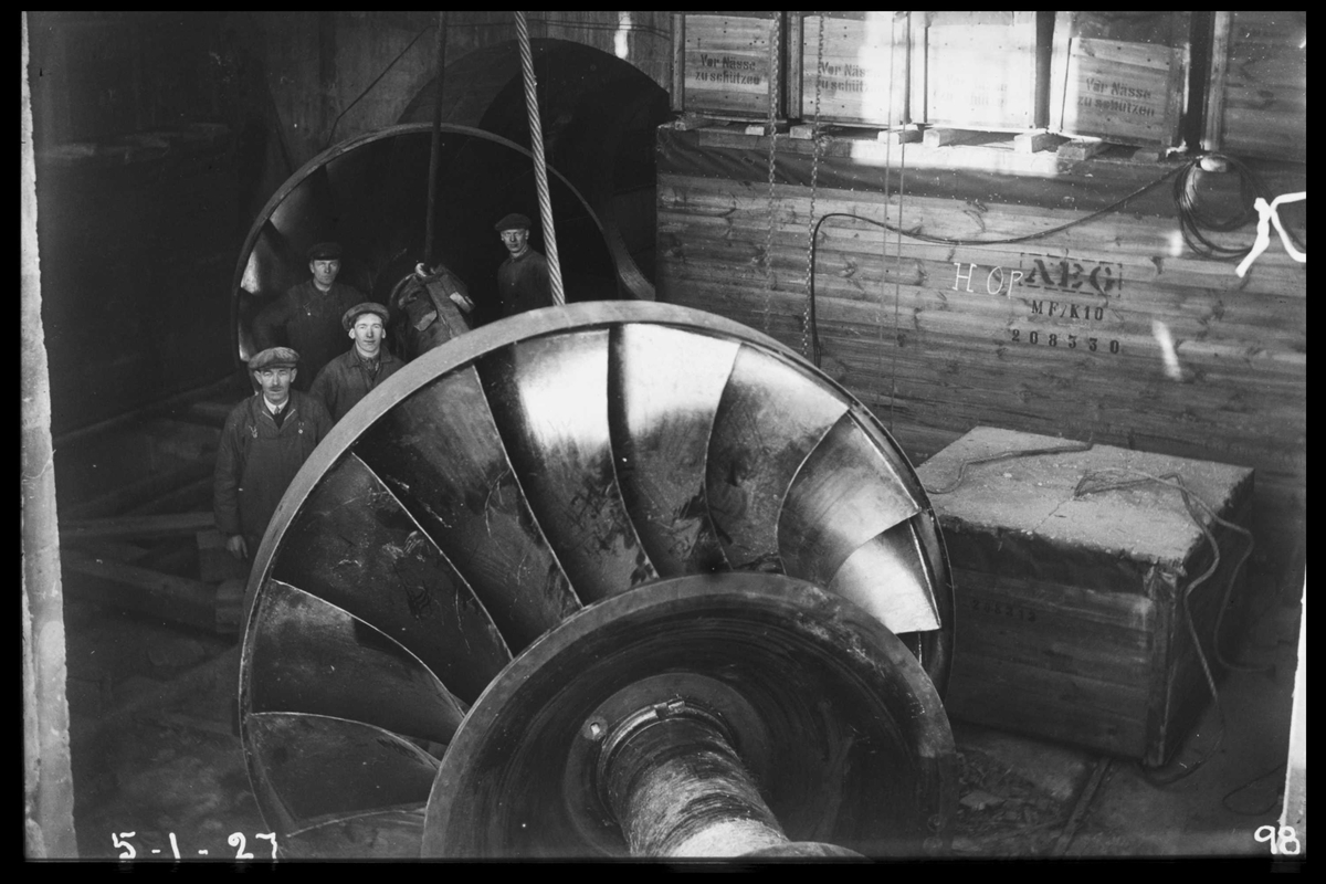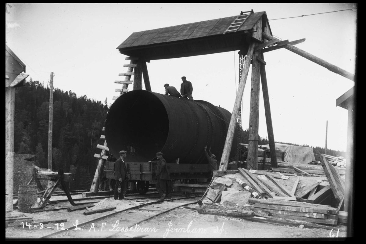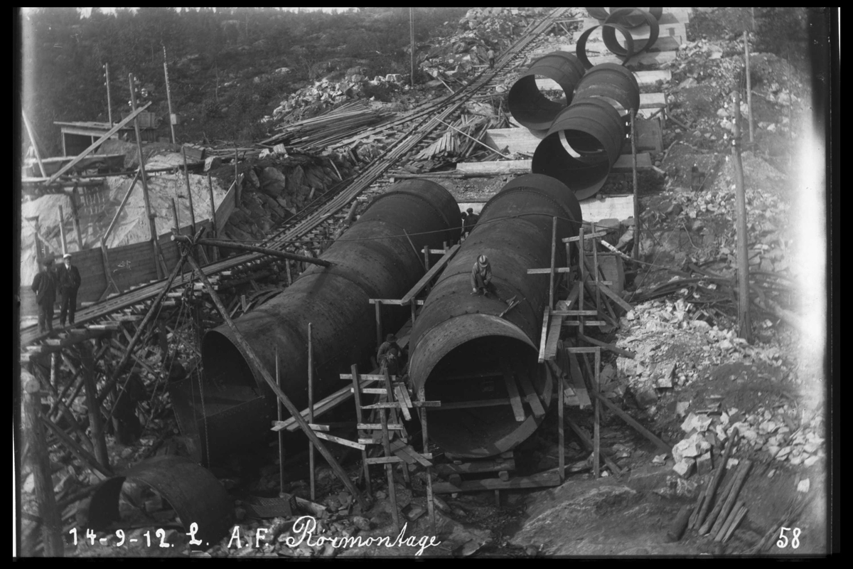 Bygging av den første rørgaten ved "Bøilefoss kraftstation" 1912. Rørdeler og turbinhjul (nede t.v.)