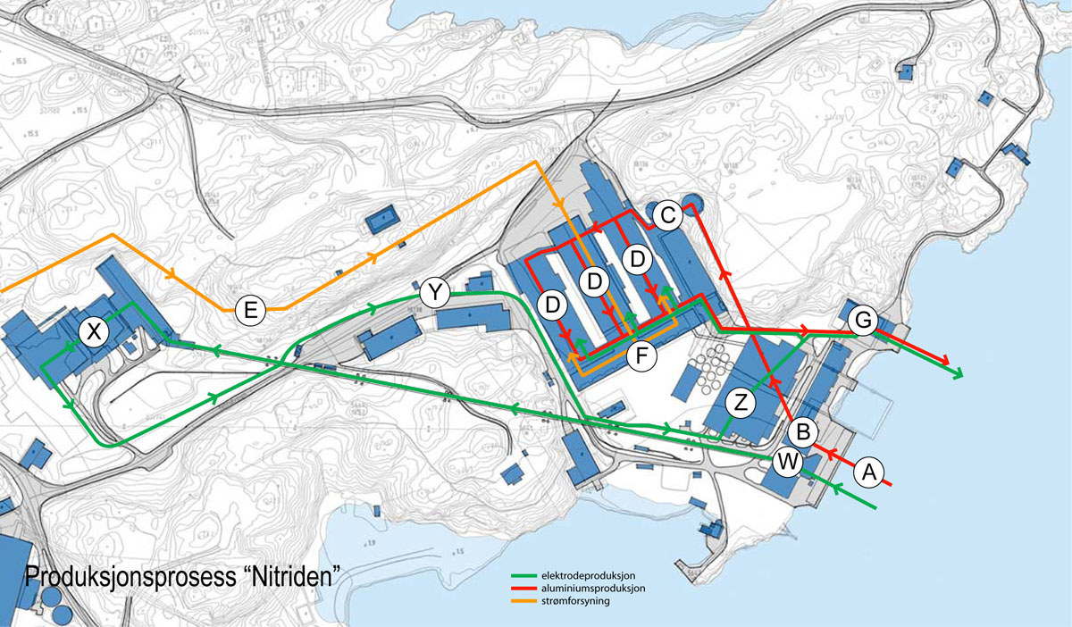 Elektroovnene som smeltet aluminium trengte elektroder (+anoder og -katoder). Disse ble laget av antrasittkoks og bek på elektrodefabrikken som lå litt vest for selve bedriften. Denne fabrikken forsynte også DNN's aluminiumsfabrikk i Tyssedal.
